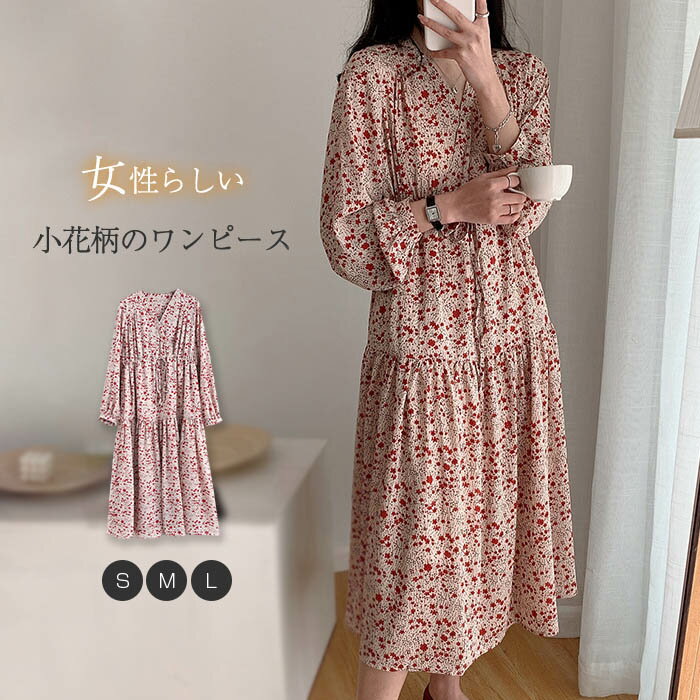 花柄 ワンピース 長袖 ロング フレアワンピース aラインワンピース 総柄 ミモレ丈 レディース ロングワンピース 春 秋 おしゃれ フレア ハイウエスト ティアード リボン aライン 春秋