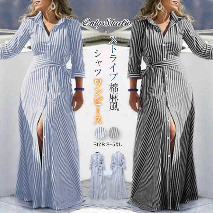 シャツワンピース ワンピース レディース ロングワンピース ロング ワンピ リボン 折り襟 七分袖 ・・・