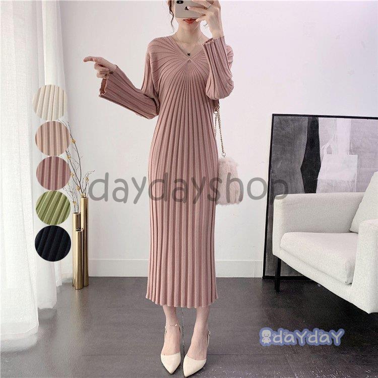 ニットワンピース レディース Vネック ワンピース 秋 冬 長袖 きれいめ 上品 ロングワンピース ・・・