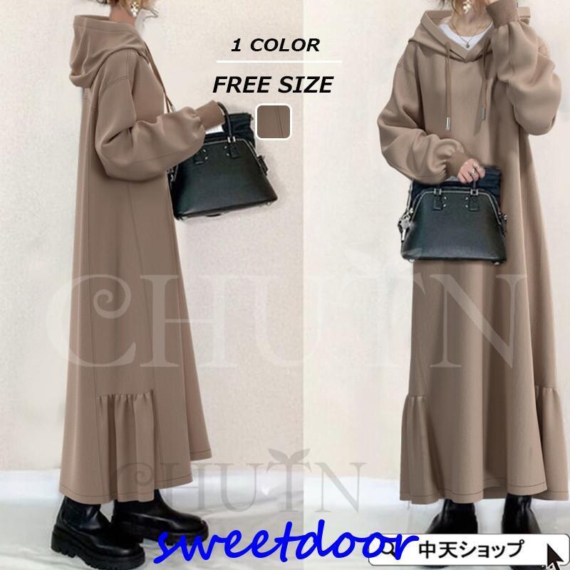 パーカーワンピース Aラインワンピース マキシワンピース ロング丈 長袖ワンピース 着痩せ フード ・・・