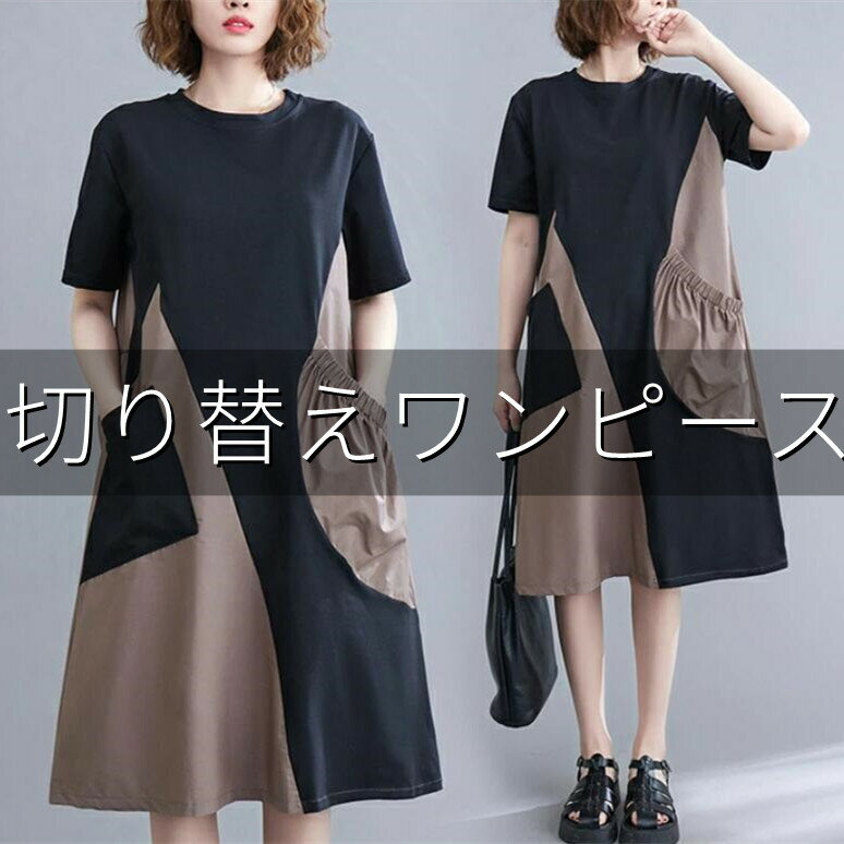 ワンピース 膝丈 レディース 切り替え ワンピース 夏 チュニック ワンピース 半袖 aライン Aライン バイカラー ゆったり 着痩せ 体型カバー シンプル おしゃれ きれいめ カジュアル