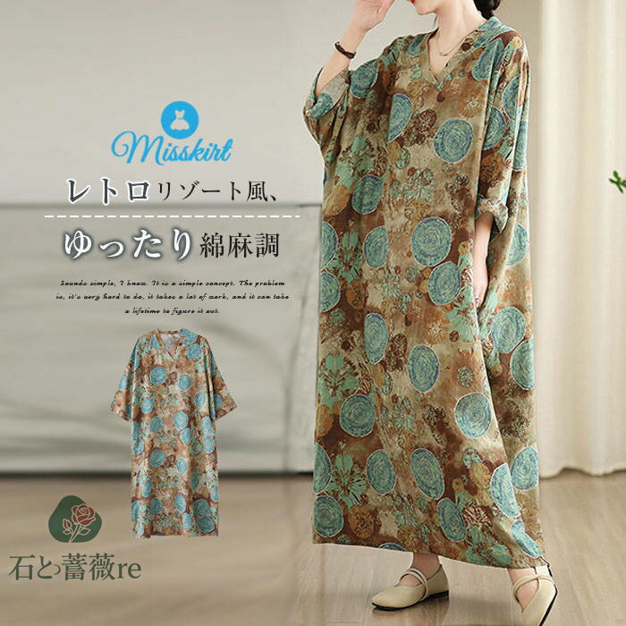 ワンピース 花柄 Vネック 新作 レディース 長袖 綿 綿麻調 プルオーバー プリント ロングワンピ・・・