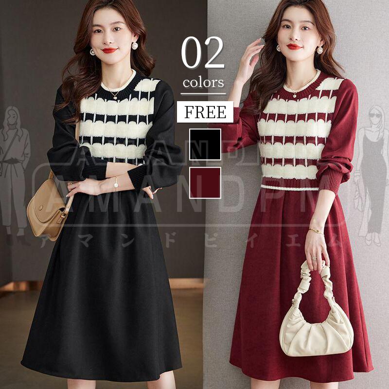 ワンピース レディース きれいめ カジュアル 春 秋 冬 秋冬 ロング インナー ロングワンピース フォーマル Aライン ボーダー柄 切り替え 黒 レッド