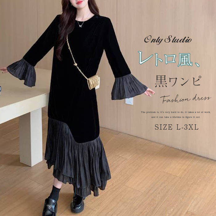 【送料無料◎宅配便発送】ワンピース ベロア レディース 新作 長袖 無地 マーメイドワンピース フレアスリーブ ラウンドネック プルオーバー ロング ワンピ エレガント レトロ 通勤 大人