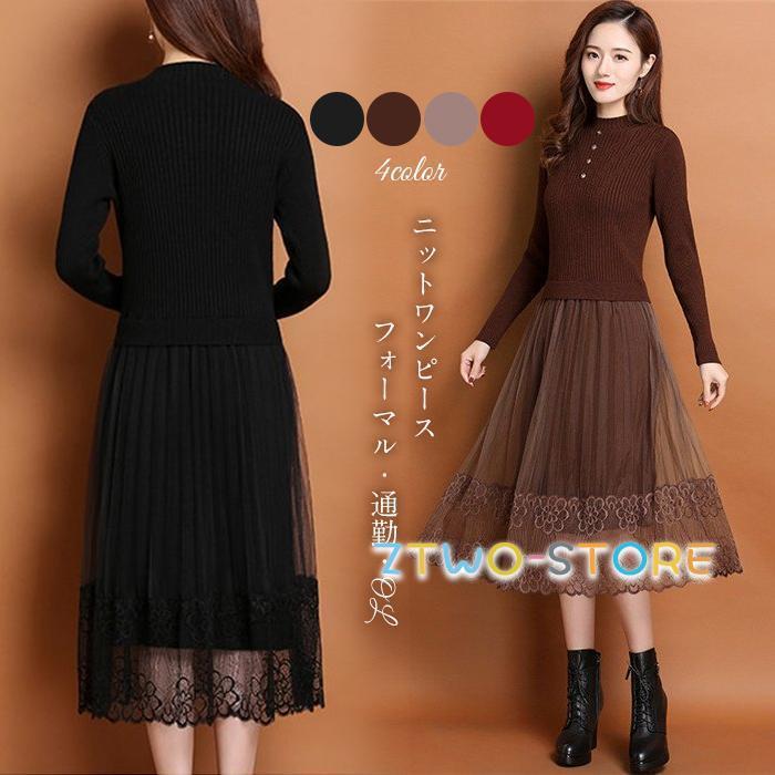 ニットワンピース 長袖 レディース ミモレ丈 着痩せ レーススカート レース裾 通勤 OL ニット ・・・