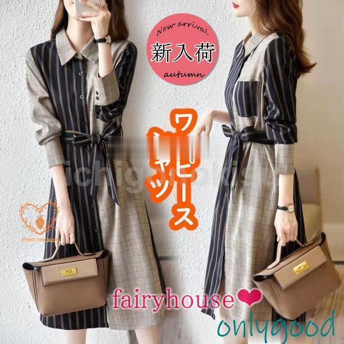 シャツワンピース レディース 40代 秋冬 長袖ワンピース 配色 切り替えストライプ柄 チェックワン・・・