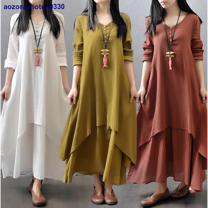 ワンピース コットンリネン ロングワンピース 綿麻混 長袖 半袖 ロング丈ワンピース 体型カバー 大・・・