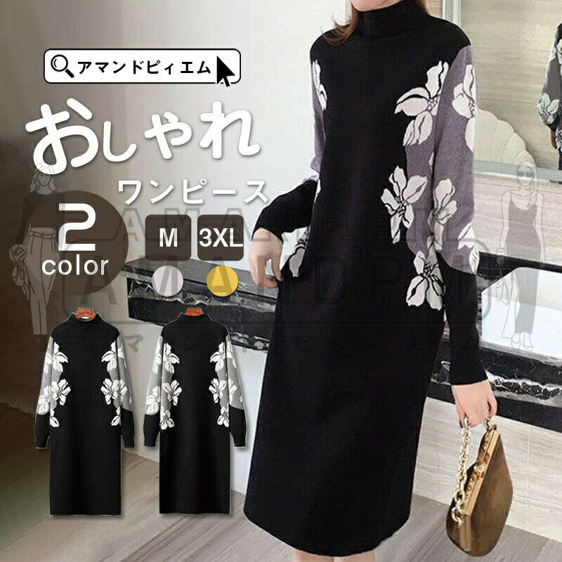 ニットワンピース レディース 秋冬 膝丈 ワンピース 厚手 きれいめ 花柄 上品 ワンピース 大人 ・・・