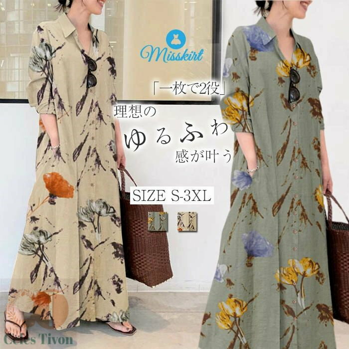シャツワンピース ワンピース レディース ロングワンピース フリル ロング プリント ゆるっとワンピ・・・