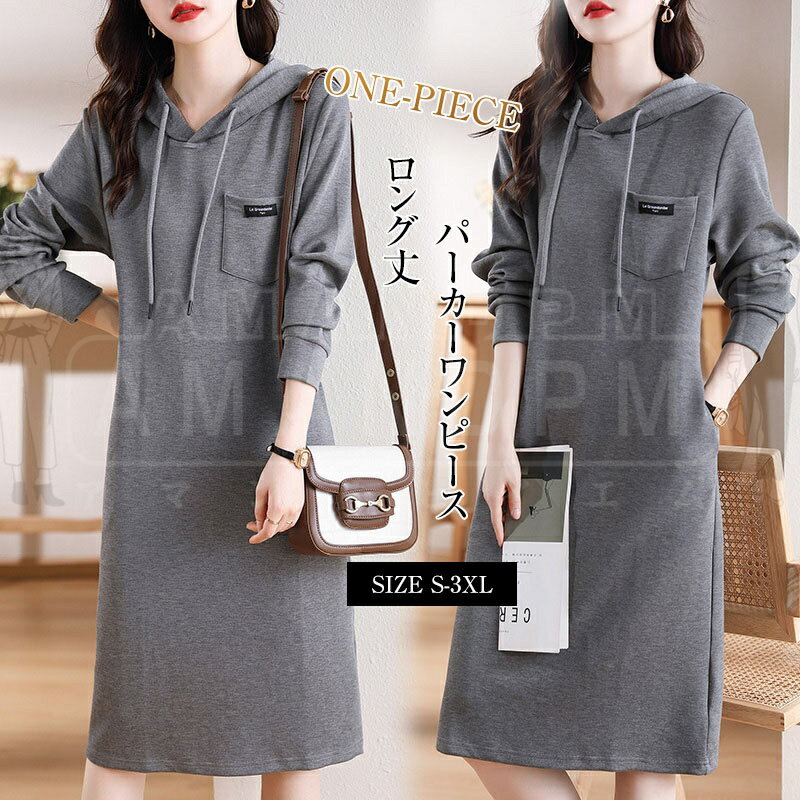 ワンピース 秋冬 きれいめ 長袖 パーカー風 ロングワンピース マキシワンピース フード付き 丸首 ミモレ丈 Aライン 無地 通勤 通学 30代 40代 50代