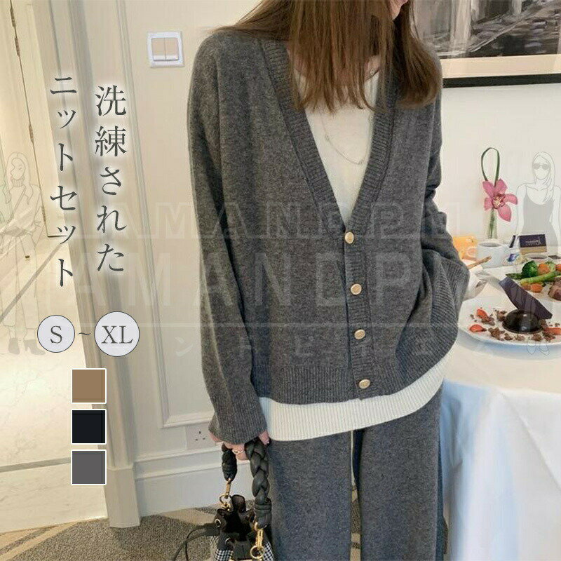 セットアップ レディース ニット 春 ニットセーター コーデ 秋 上品 Vネック レイヤード 着痩せ ワイドパンツ 30代 40代 50代