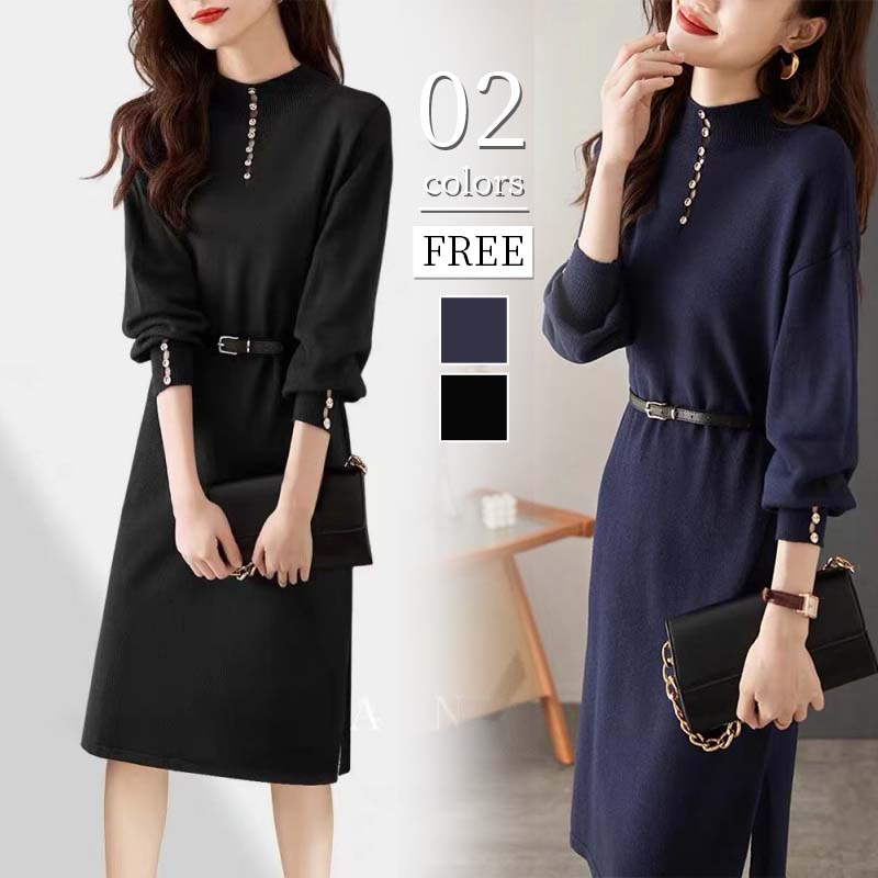 ニット ワンピース レディース きれいめ カジュアル 春 秋 冬 秋冬 ロング ベルト付き ボタン飾り クルーネック ニットワンピース 無地 長袖 ロング ワンピ オフィス