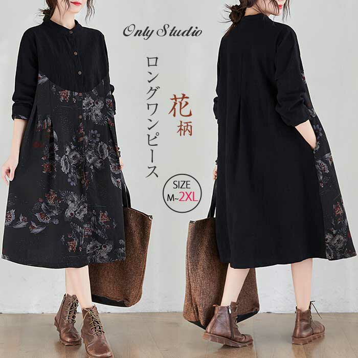 ★メール便送料無料★ワンピース ロングワンピース ロングワンピ レディース ロング丈 マキシ丈 ゆるっとワンピース 長袖 花柄 ゆったり ポケット付き 綿混紡 体型カバー シンプル 秋 冬