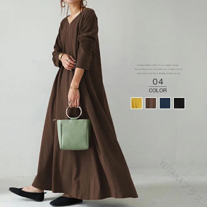 女性に人気の春秋用ロングワンピース 体型カバーでゆったり着心地が良く30代から50代におすすめの秋レディース服