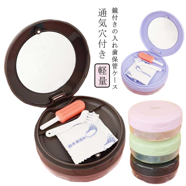 鏡付き 通気穴付き 入れ歯用歯ブラシ付 義歯 付け歯ケース リテーナーケース おしゃれ 通気穴付き 軽量 洗浄ケース コンパクト