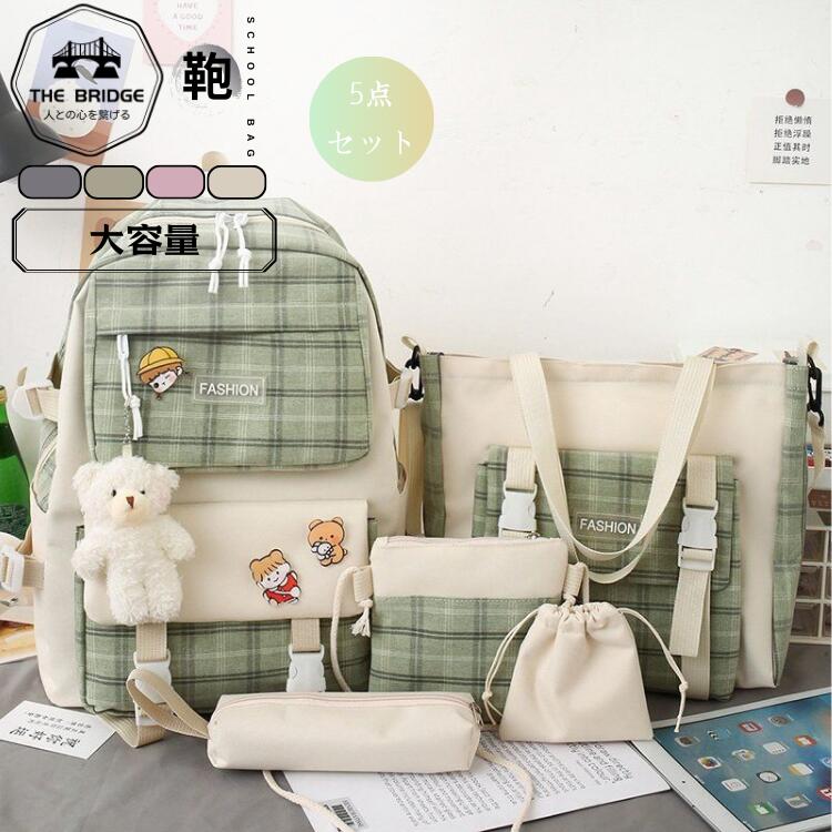 チェック柄 バックパック リュック 大容量 通学 5点セット 選べる4色 黒 緑 カーキ ピンク 可・・・