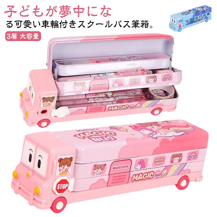 筆箱 スクールバス 男の子 可愛い 鉛筆ボックス 女の子 小学生 3層 メタル 筆入れ 動くタイヤ ・・・