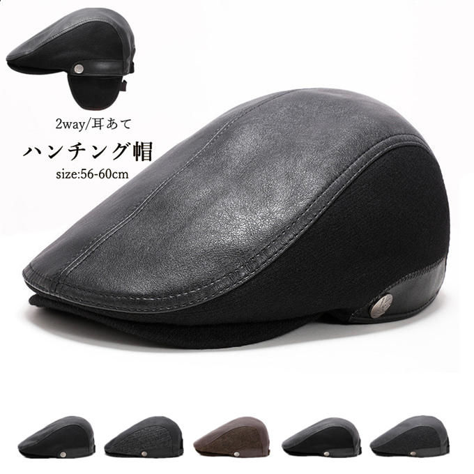 ハンチング メンズ 帽子 ハンチング PU帽子 耳あて付 あったか 防寒 暖かい 秋冬