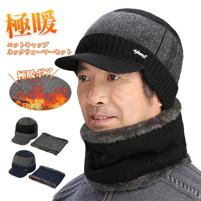 ニット帽子 耳あて付 ネックウォーマーセット 男性 メンズ 2点セット 3色選択 ニット帽 耳あて ニットキャップ 防寒 裏起毛 秋冬 裏ボア 暖かい あったか 通気性