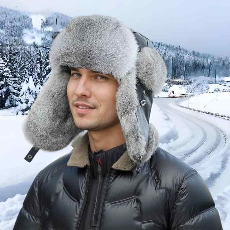 帽子 男性用 牛革 ラビットファー 雷鋒帽 秋冬 防寒 保温 耳当て付き 灰色 ブラック カーキ色 ・・・