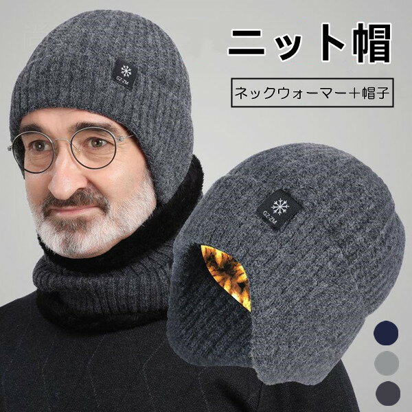 ニット帽子 耳あて付 ネックウォーマーセット 男性 メンズ 2点セット 3色選択 ニット帽 耳あて ニットキャップ 防寒 裏起毛 秋冬 裏ボア 暖かい 通気性 保温性