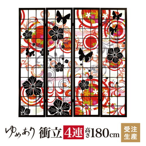 衝立 和風 花・蝶・なでしこ 赤 幅45cm×高さ180cm×4連 木製 ついたて 間仕切り パーテ・・・