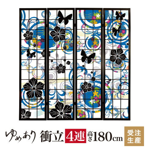 衝立 和風 花・蝶・なでしこ 青 幅45cm×高さ180cm×4連 木製 ついたて 間仕切り パーテ・・・