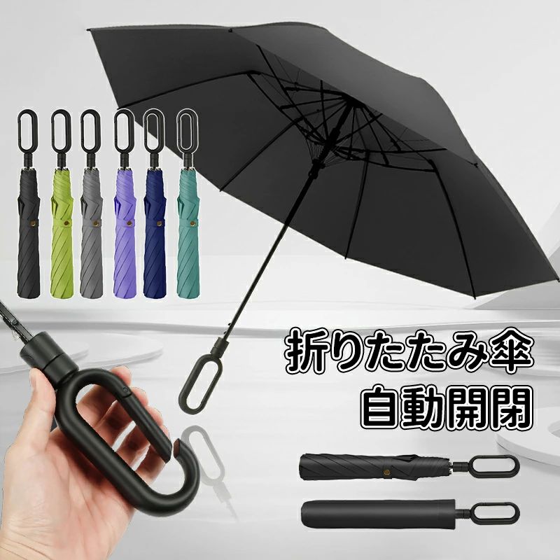 自動開閉折りたたみ傘 カラビナハンドルつき 逆折りタイプ 三段式 収納やすい ドア 鞄 ベビーカーに掛ける ママグッズ 超撥水 耐風傘 男性も女性も使いやすい