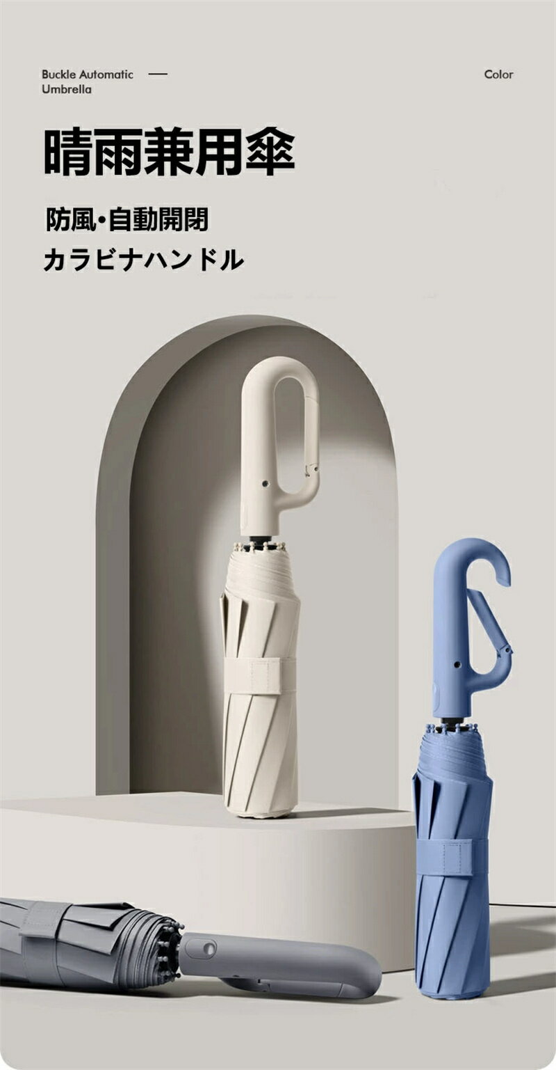 自動開閉折りたたみ傘 カラビナハンドルつき 逆折りタイプ 三段式 収納やすい ドア 鞄 ベビーカーに掛ける ママグッズ 超撥水 耐風傘 男性も女性も使いやすい 【2タイプ・5カラー】