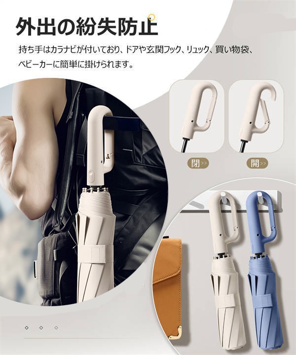自動開閉 逆さ傘 紫外線遮断 カラビナハンドル 収納やすい ドア・鞄カバン・ベビーカーに掛ける ママグッズ 男女兼用 使いやすい ハンズフリー 梅雨 雨の日 暑い日 コンパクト 耐風