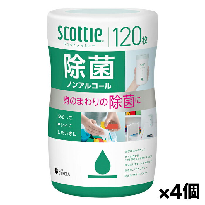 [日本製紙クレシア]スコッティ ウェットティシュー 除菌 ノンアルコール 120枚 x4個(除菌シート 手指 洗浄 ボトル)
