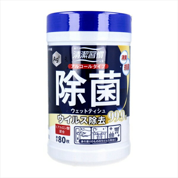 送料無料 iiもの本舗 除菌ウェットティシュ 清潔習慣 アルコールタイプ ウイルス除去 ヒアルロン酸配合 厚手シート ボトル本体 80枚入り