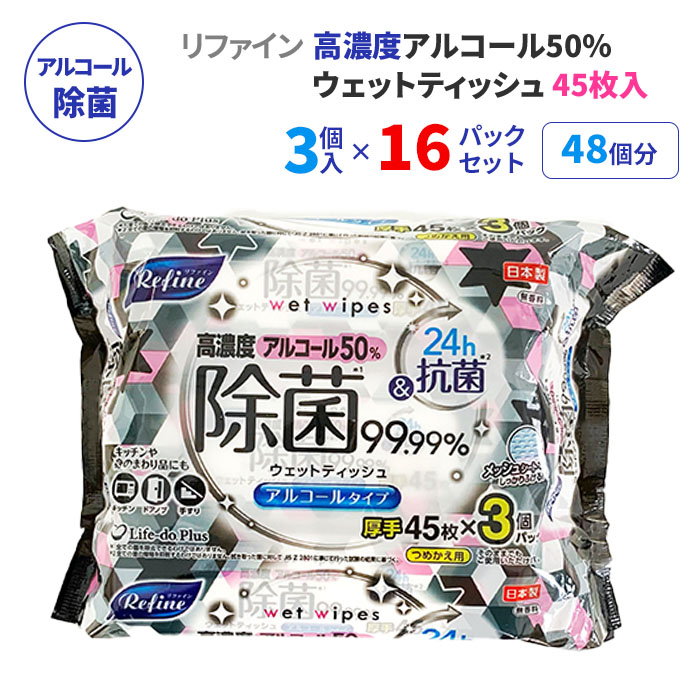 リファイン 高濃度アルコール50%除菌ウェットティッシュ 厚手 45枚3P 16パックセット(48個・・・
