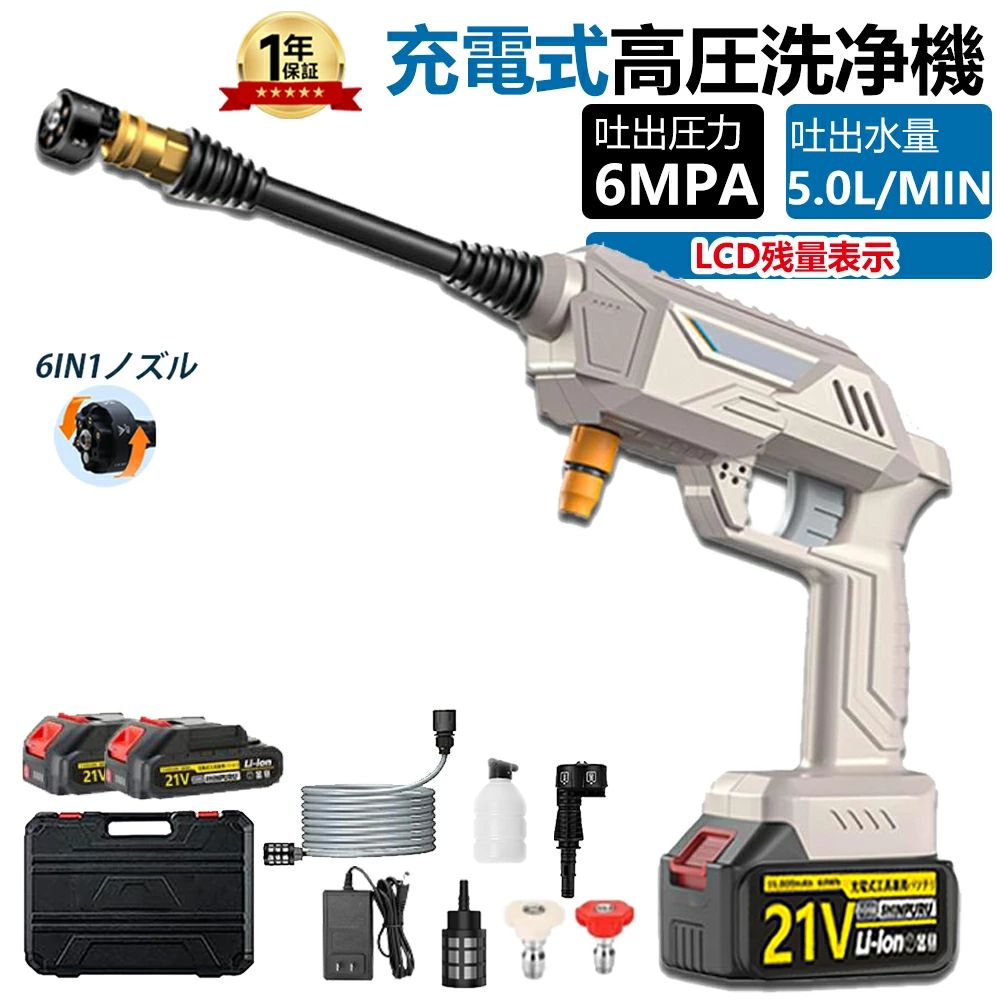高圧洗浄機 コードレス 充電式 水圧洗浄機【5MPA吐出圧力 水噴射量5.2L/min 6-in-1ノズル】 自吸式 ポータブル ガン 洗車機