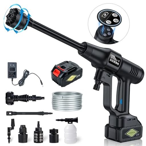 ポータブルコードレス高圧洗浄機 600 PSI 3.0Ah充電式バッテリー駆動 6-in-1ノズル付・・・