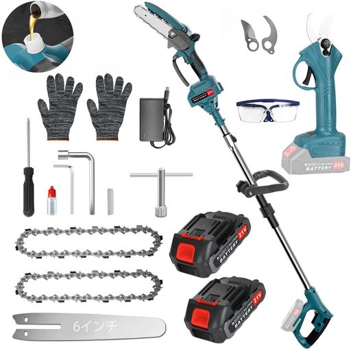 充電式剪定バサミ 充電式6インチハンディーチェーンソー 高枝切り竿・充電器・バッテリー付きの便利なセット。到着後すぐ使える!