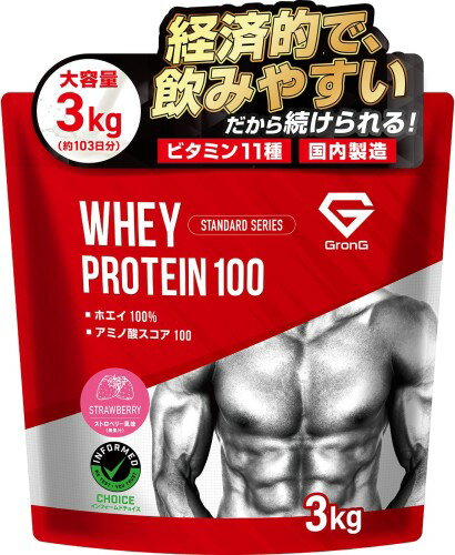 グロング プロテイン ホエイプロテイン 3kg ホエイ スタンダード ストロベリー風味 ビタミン11・・・