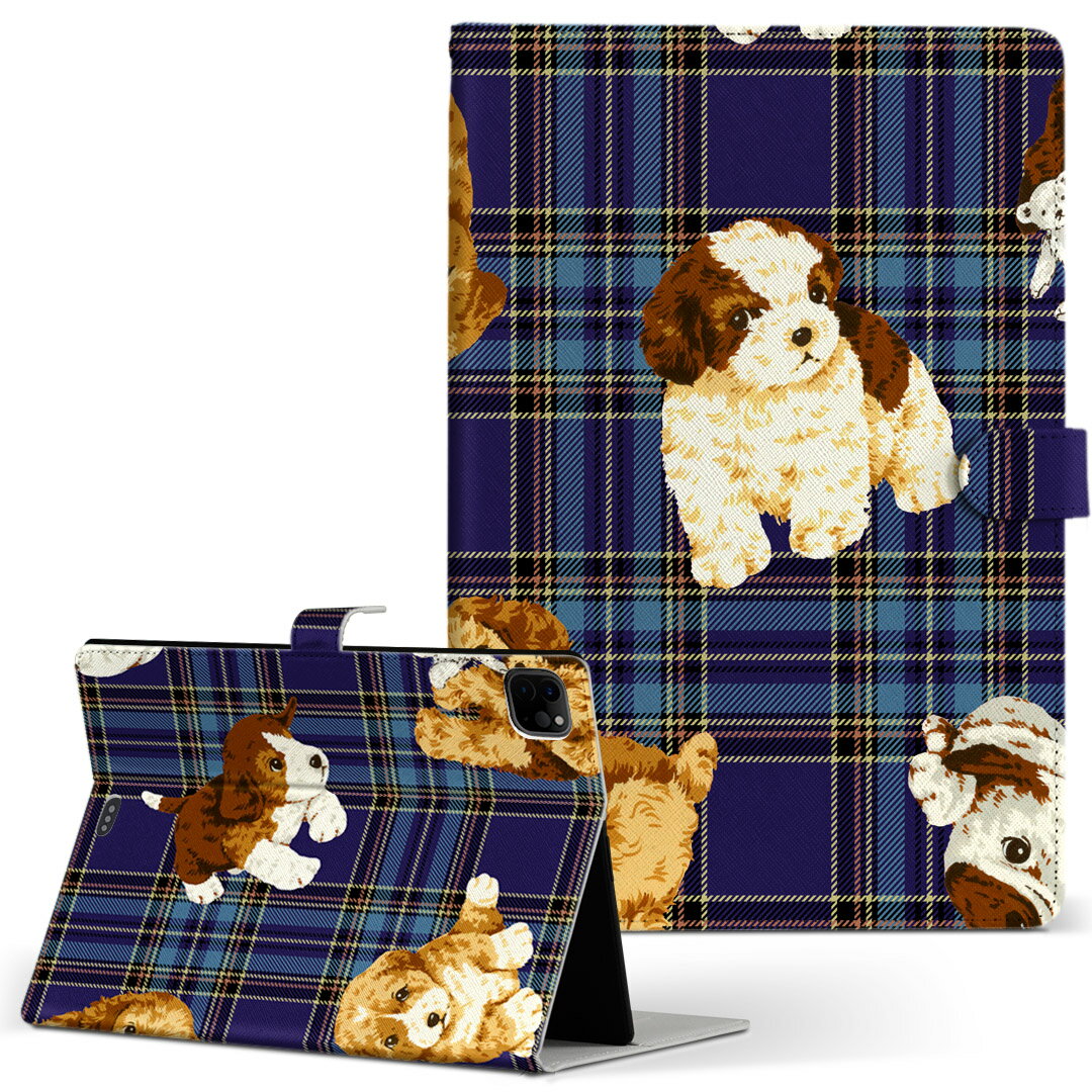 iPad 手帳型ケース アニマル 青 ブルー チェック 犬